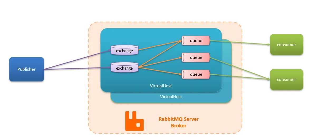 - publisher:消息发布者,将消息发送到队列queue