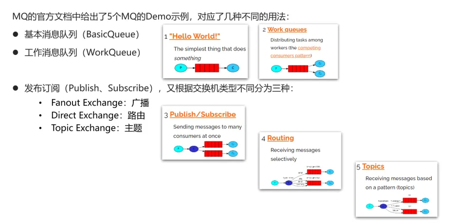 MQ的官方文档RabbitMQ Tutorials | RabbitMQ中给出了5个MQ的Demo示例,对应了几种不同的用法: