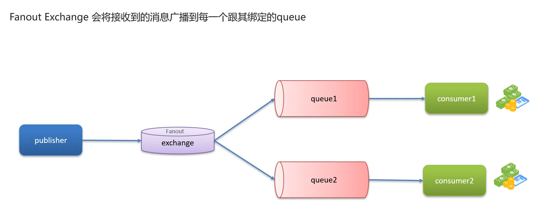 - FanoutExchange的会将消息路由到每个绑定的队列