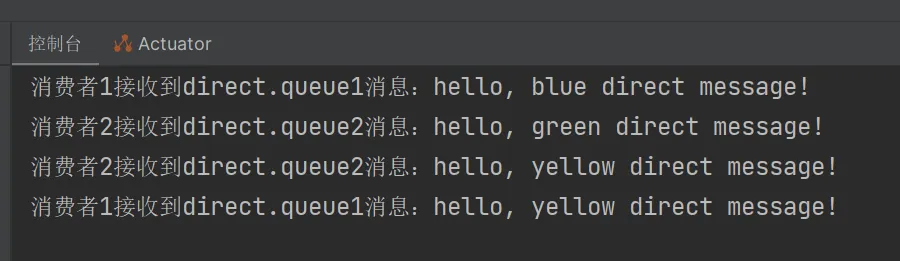 rabbitTemplate.convertAndSend(exchangeName, "yellow", "hello, green direct message!");