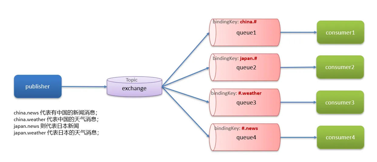 TopicExchange与DirectExchange类似,区别在于routingKey必须是多个单词的列表,并且以 . 分割。