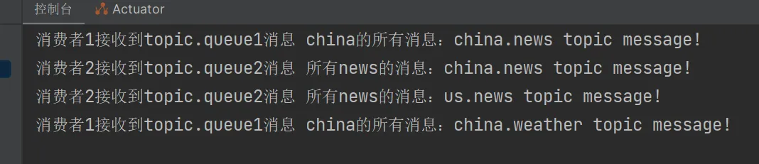 rabbitTemplate.convertAndSend(exchangeName, "china.weather", "china.weather topic message!");