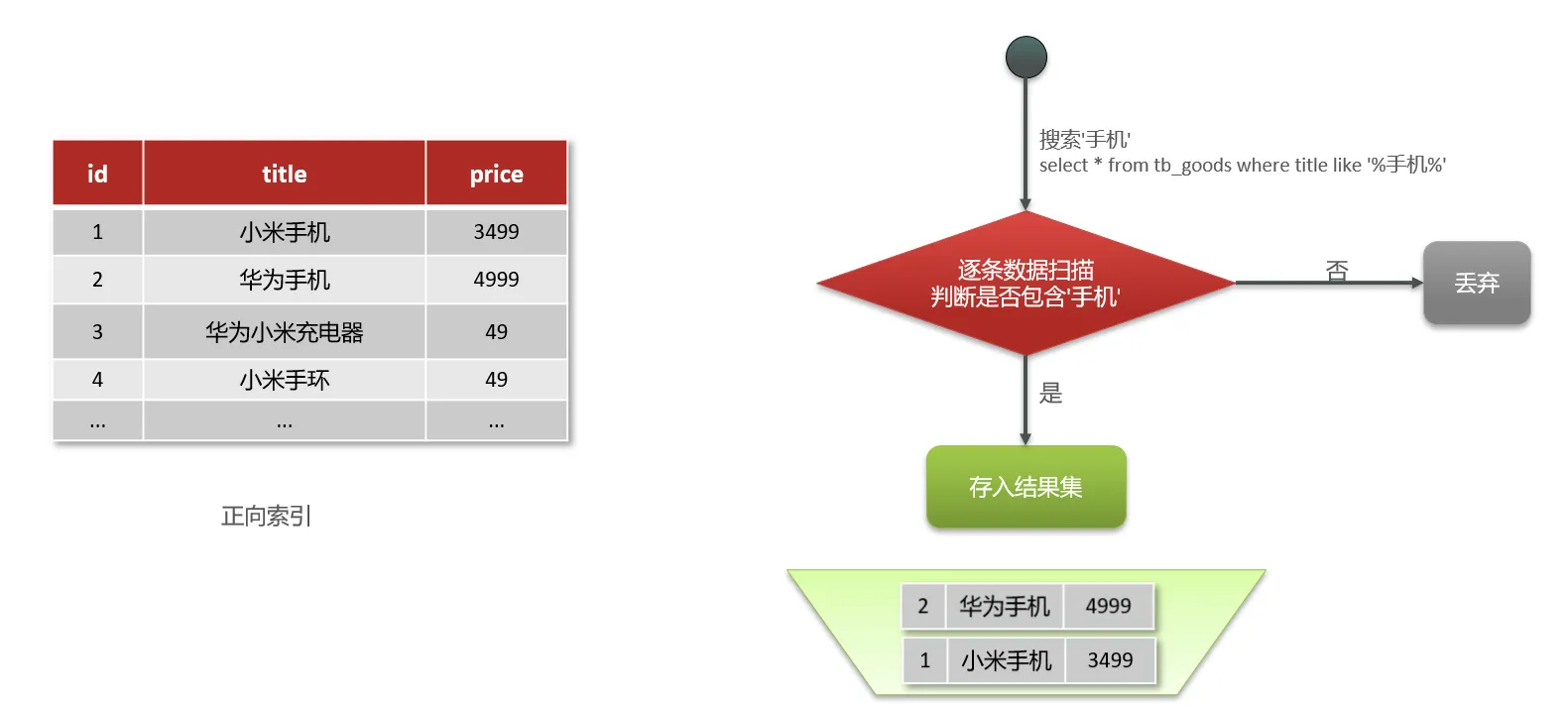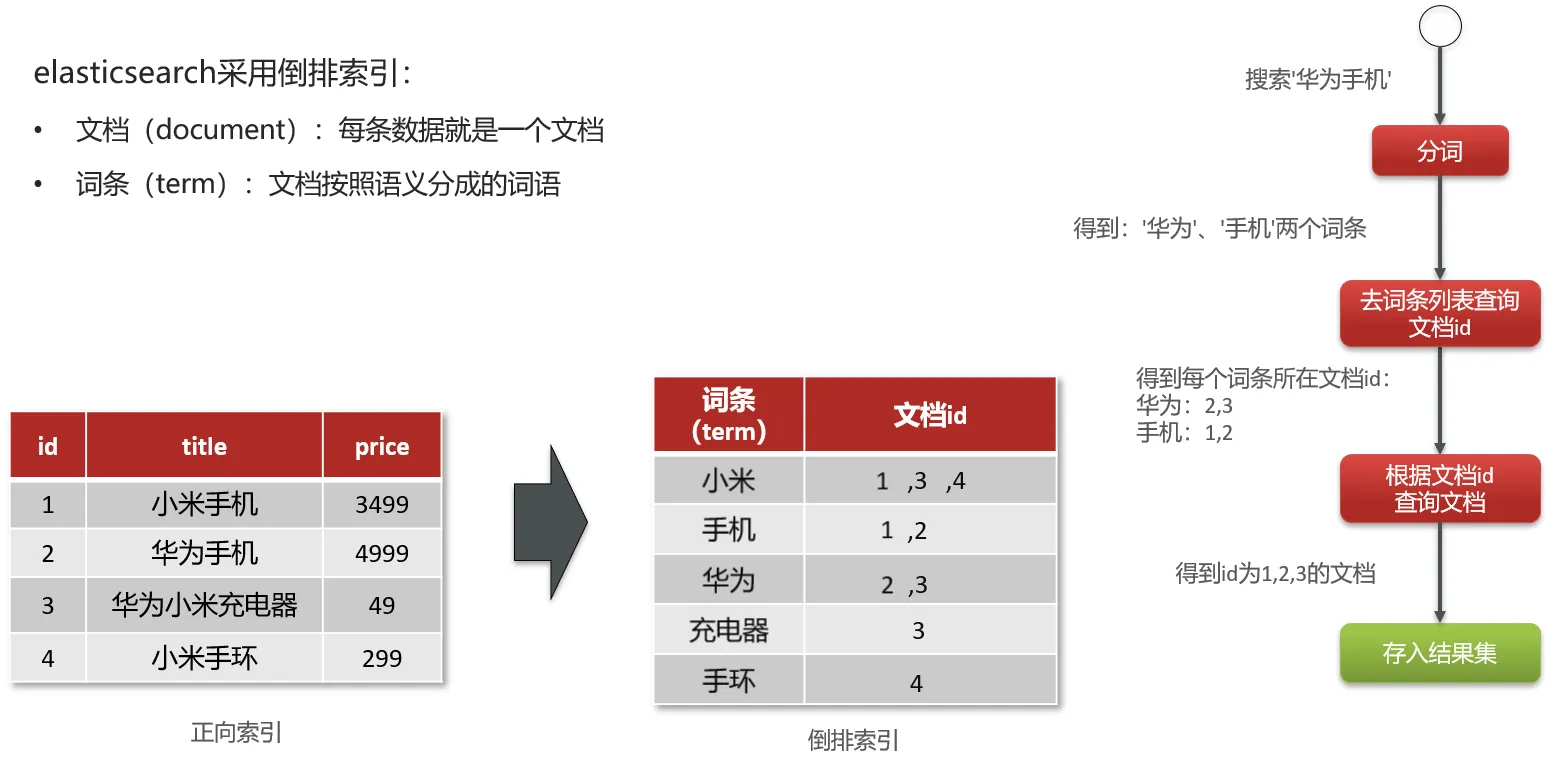 :::color1 对文档内容分词,对词条创建索引,并记录词条所在文档的信息。查询时先根据词条查询到文档id,而后获取到文档