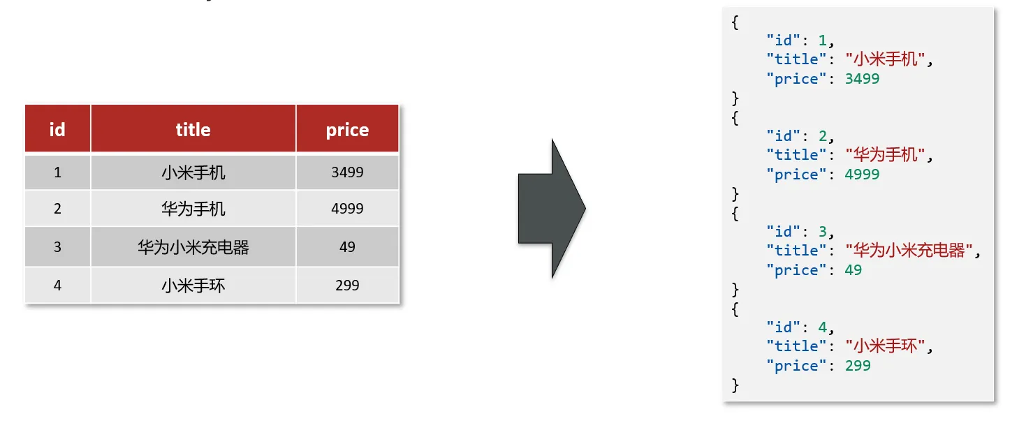 | Row | Document | 文档(Document),就是一条条的数据,类似数据库中的行(Row),文档都是JSON格式 |