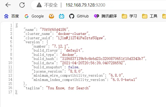 在浏览器中输入:http://虚拟机ip:9200 即可看到elasticsearch的响应结果: