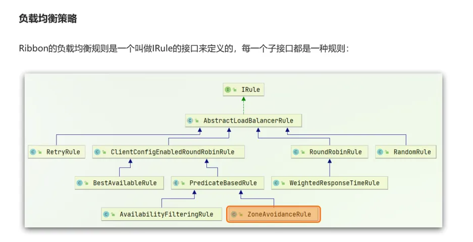 | ZoneAvoidanceRule | 以区域可用的服务器为基础进行服务器的选择。使用Zone对服务器进行分类,这个Zone可以理解为一个机房、一个机架等。而后再对Zone内的多个服务做轮询。 |