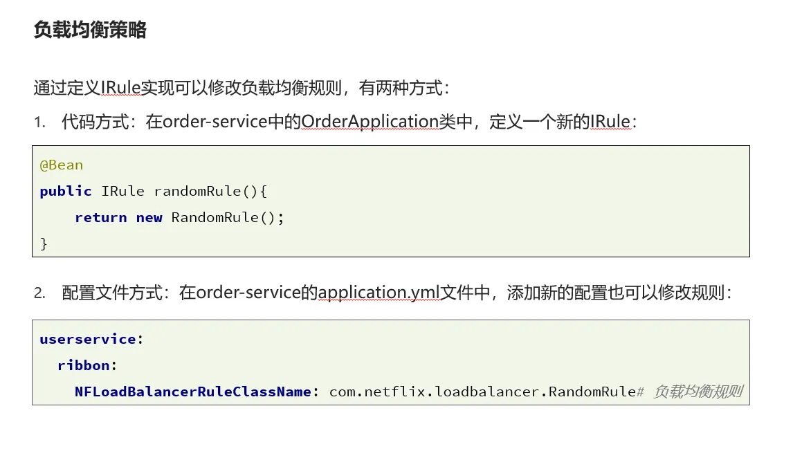 注意:第一种方式为全局设置(order服务访问任何微服务都为随机策略),第二种方法可以针对单个微服务设置负载均衡