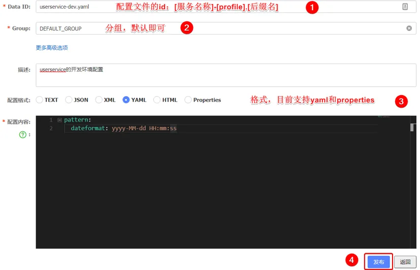 - [spring.application.name]-[spring.profiles.active].yaml,例如:userservice-dev.yaml