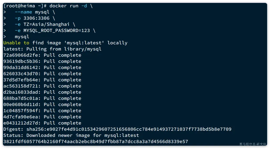 大家可以发现,当我们执行命令后,Docker做的第一件事情,是去自动搜索并下载了MySQL,然后会自动运行MySQL,我们完全不用插手,是不是非常方便。