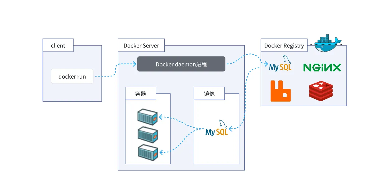 Docker本身包含一个后台服务,我们可以利用Docker命令告诉Docker服务,帮助我们快速部署指定的应用。Docker服务部署应用时,首先要去搜索并下载应用对应的镜像,然后根据镜像创建并允许容器,应用就部署完成了。